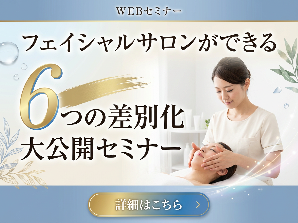 フェイシャルサロンができる6つの差別化大公開セミナー この記事をシェアする Application form 関連セミナー情報 【4月1日配信】明日から2倍の新規を集める 脱個人サロンの集客勝ち方まとめセミナー #エステ 1年10店舗の多店舗展開サロン採用ブランディングの7つの方法大解説セミナー #エステ 明日から契約率70%以上をたたき出すカウンセリング講座 #エステ